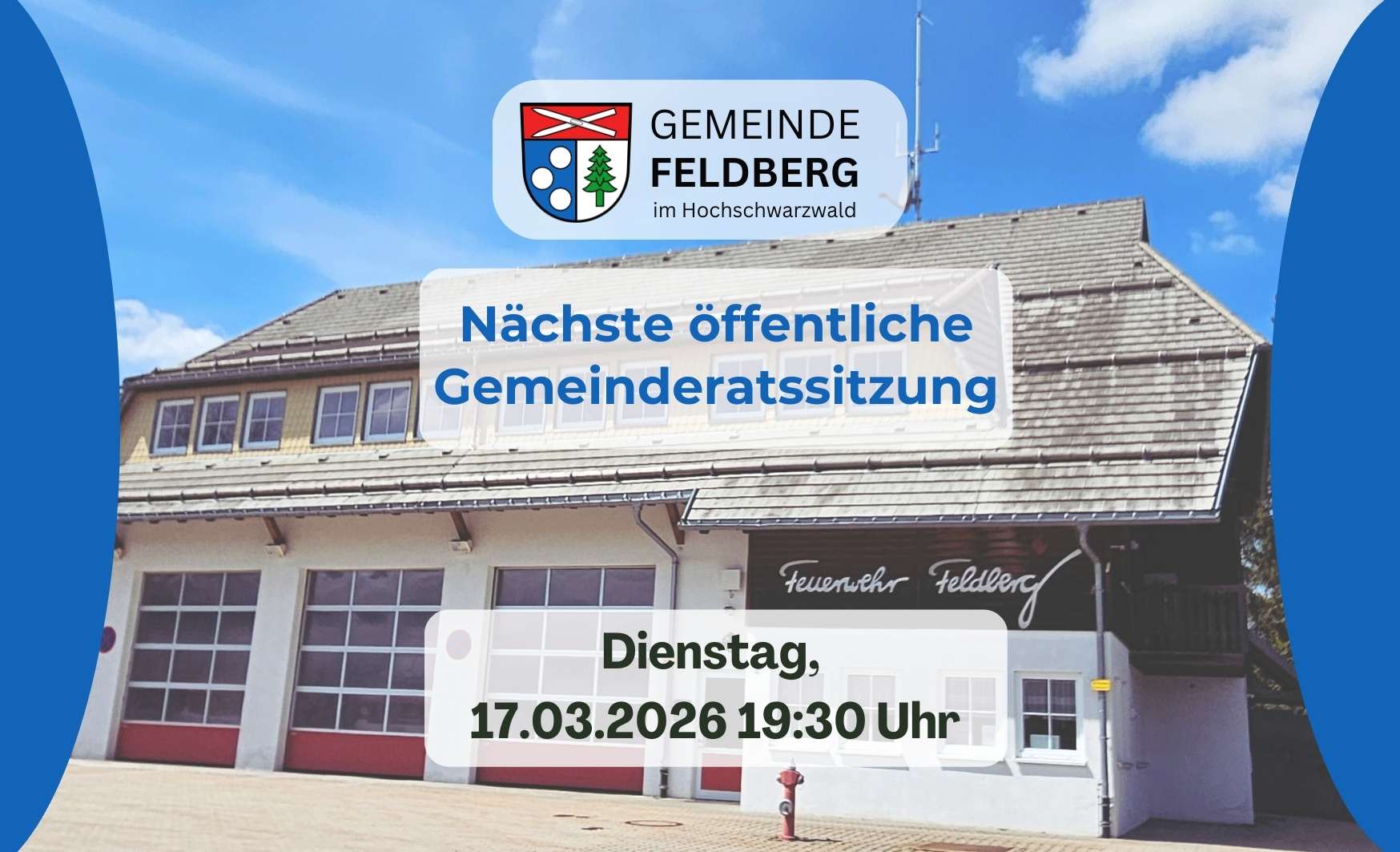 Öffentliche Bekanntmachung Gemeinderatssitzung am Dienstag, den 20.01.2026 um 19:30Uhr im Feuerwehrhaus, Sitzungssaal, Dreiseenbahnweg 2, 79868 Feldberg Tagesordnung: 1 Bekanntgabe der Beschlüsse aus der letzten nichtöffentlichen Gemeinderatssitzung 2 Wünsche und Anträge…