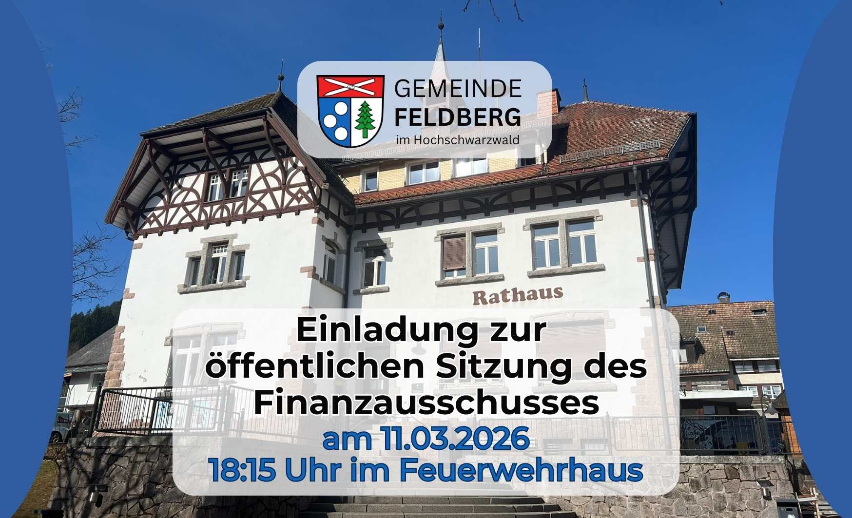 Öffentliche Bekanntmachung Öffentliche Sitzung des Finanzausschusses am Mittwoch, den 11.03.2026 um 18:15Uhr im Feuerwehrhaus, Sitzungssaal, Dreiseenbahnweg 2, 79868 Feldberg Tagesordnung: 1 Wünsche und Anträge aus der Bevölkerung 2 Beratung Haushalt…
