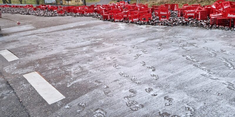 am Geißenstall (Bundesstraße bei Kuve Skilift Altglashütten) ist heute Morgen ein Biertransporter verunglückt. Neben reichlich Bierschaum auf der Fahrbahn liegen derzeit zahlreiche Rothaus‑Kisten am Straßenrand – ein eher ungewöhnliches Bild für die Bundesstraße.