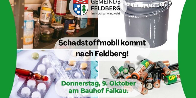 Anfang Oktober startet wieder die landkreisweite Schadstoffsammlung der ALB. In der Gemeinde Feldberg am Donnerstag, den 9. Oktober von 9:30 Uhr bis 11:30 Uhr am Bauhof in Falkau (Feserstegweg 15).…